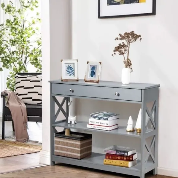 Entrékonsolen COSTWAY är en praktisk och elegant möbel för din hall eller vardagsrum. Den är tillverkad av MDF och erbjuder gott om förvaringsutrymme med en låda och två hyllor. Dess X-formade struktur ger den stor stabilitet och den kan bära upp till 95 kg. Den är lämplig för olika platser som vardagsrum, hall eller entré.