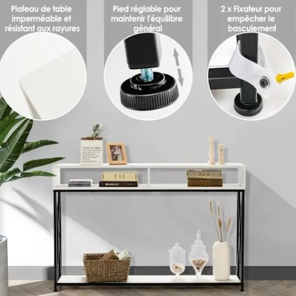 Material: Stål + kompositträ Produktmått: 120 x 23 x 79 cm (L x B x H) Den robusta stålramen och tjocka brädor säkerställer konsolens stabilitet Den öppna hyllan såväl som förvaringsfacken ger plats för förvaring av små föremål Slät, vattentät yta är lätt att rengöra med bara en torka