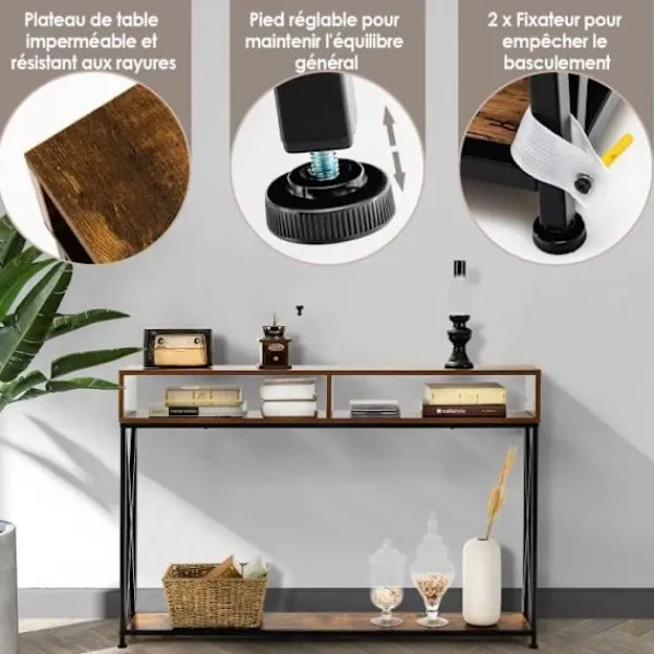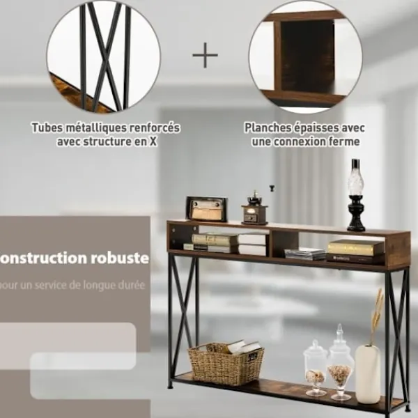 COSTWAY-konsolen i industriell stil är en funktionell och elegant entrémöbel. Med sina 2 hyllor och 2 fack ger den gott om förvaringsutrymme för små föremål ytan är lätt att rengöra med en enkel avtorkning av en trasa