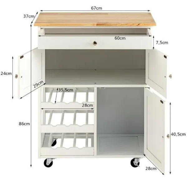 Denna köksvagn på hjul är idealisk för flyttning och förvaring. Tillverkad av vattentätt och reptåligt naturgummiträ, den är utrustad med 4 svängbara hjul för tyst och mjuk rörelse. Den kan lagra upp till 9 flaskor rött vin och är perfekt att använda i köket, restaurangen eller baren.