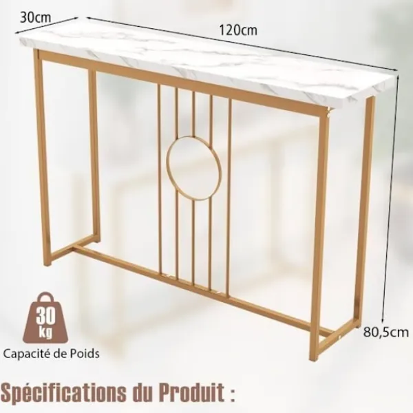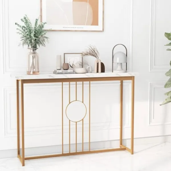 Vårt eleganta konsolbord i fuskmarmor är kompatibelt med olika hem- och inredningsstilar, vilket fungerar perfekt som entrébord, foajébord eller buffébord, etc. Den har justerbara glid och anti-lutningsanordningar för ökad stabilitet.