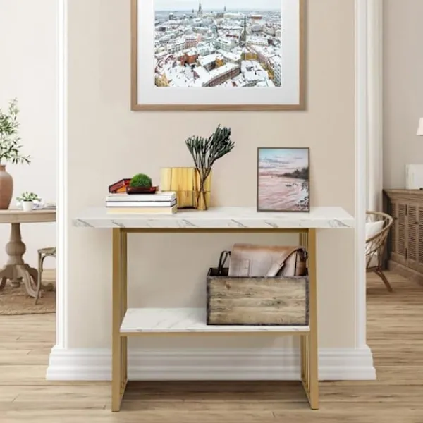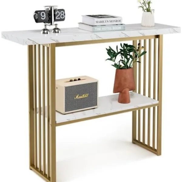 Vårt eleganta konsolbord i konstmarmor från COSTWAY är kompatibelt med olika hem- och inredningsstilar. Det fungerar perfekt som entrébord, foajébord eller buffébord. Den är utrustad med en anti-lutningsanordning och dynorna är halkfria. Materialen som används är MDF och stål.