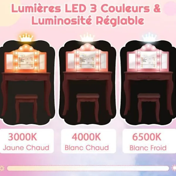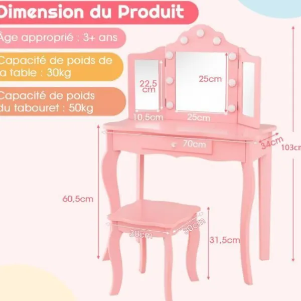 Bordsstorlek: 70 x 34 x 103 cm (L x B x H) Pallstorlek: 30 x 30 x 31,5 cm (L x B x H) Bordshöjd: 60,5 cm Förvandlas till ett skrivbord när spegeln tas bort. Utrustad med en tri- hopfällbar spegel dekorerad med LED-lampor i 3 färger Med rymlig bordsskiva och förvaringslåda Kan väggmonteras med medföljande tippskydd Tillverkad i MDF-material och silverspeglar