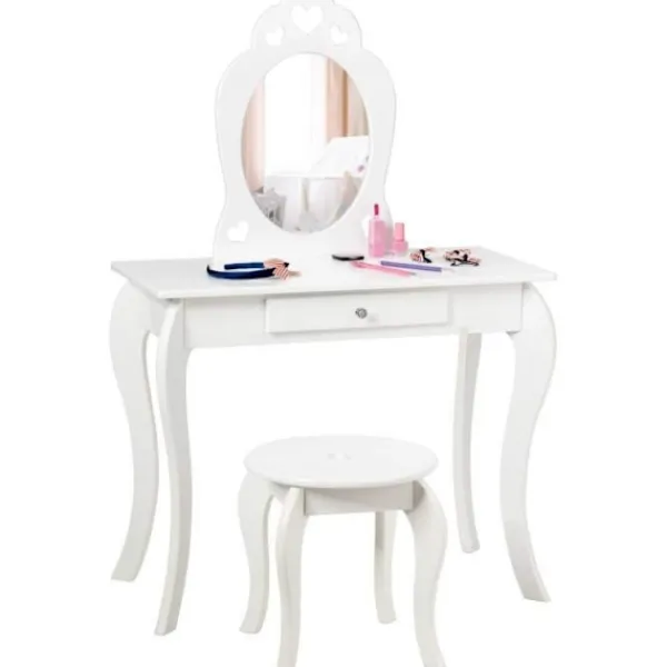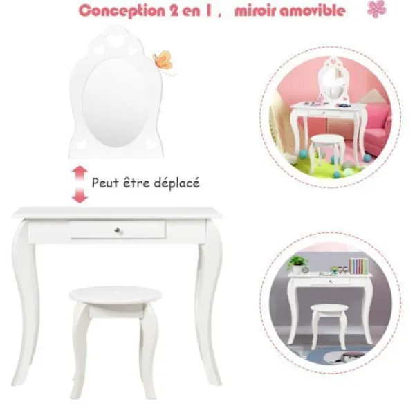 Detta sminkbord för barn från märket COSTWAY är lätt att montera och har en stor förvaringslåda. De kraftiga furubenen och halkfria gliden säkerställer stor stabilitet. Den avtagbara skivan gör att du kan förvandla sminkbordet till ett skrivbord eller läsbord. Bordets viktkapacitet är 15 kg och pallens vikt är 30 kg.