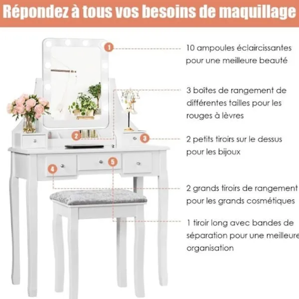 COSTWAY sminkbord med pall och 360 graders roterande spegel är perfekt för enkel makeup. Den har 10 LED-lampor med justerbar ljusstyrka och erbjuder gott om förvaringsutrymme med sina 5 lådor. Tillverkad av MDF och furu, den är robust och hållbar. Den vadderade pallen säkerställer optimal komfort. Bordsmått: 80 x 40 x 136 cm (L x B x H).