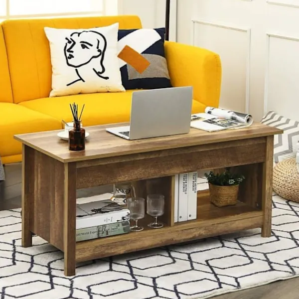 COSTWAY soffbordet med hissskiva är praktiskt och mångsidigt. Dess fjäderbelastade lyftsystem gör att pallen kan höjas och sänkas smidigt. Den har ett dolt förvaringsutrymme och 2 öppna fack i botten. Tillverkad av kvalitetskompositträ, är den hållbar och lätt att rengöra. Dess mått är 109 x 47,5 x 50-63 cm.