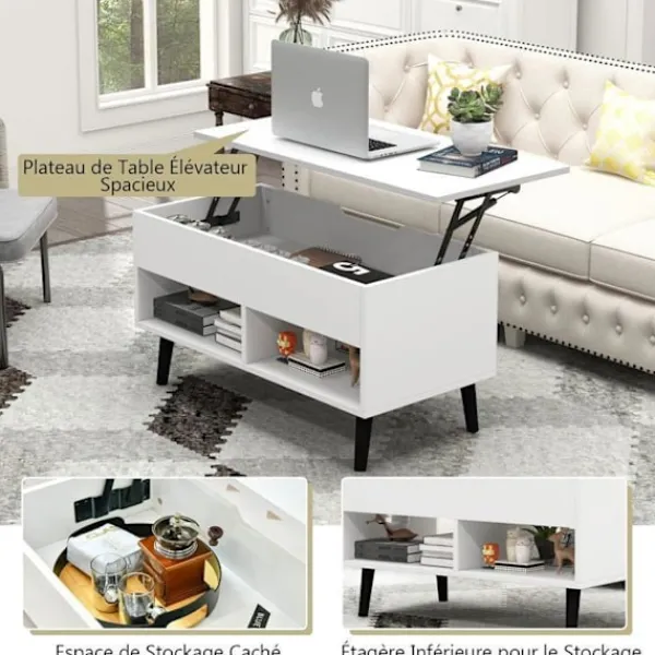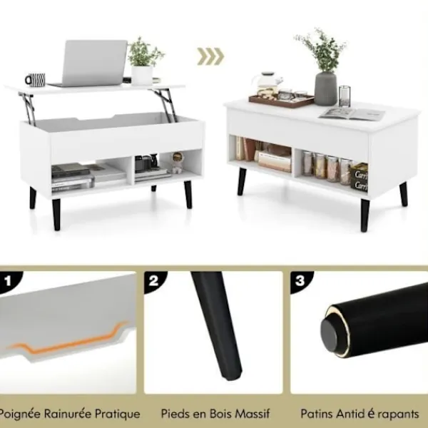 Soffbordet COSTWAY med lyftskiva och dold förvaring är en modern och designad kontorsmöbel. Den högkvalitativa gasfjäderlyftmekanismen gör det enkelt att höja och sänka däcket. Bordsben i massivt trä säkerställer god stabilitet och bärförmåga. Halkfria fotkuddar skyddar golvet från repor.