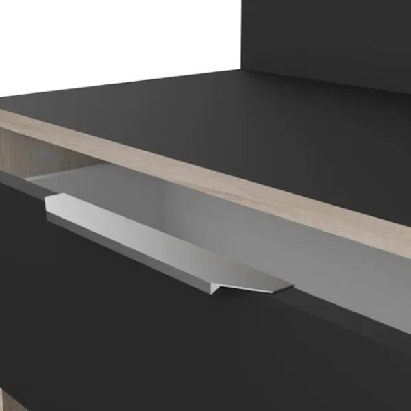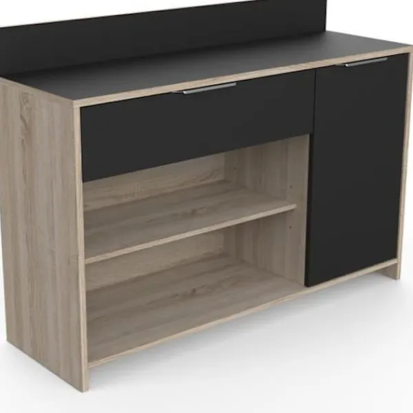 MIKE underköksskåp med rå ek och svart dekor. Denna förvaringsenhet har en dörr, en låda och två nischer, perfekt för förvaring av disk eller andra köksartiklar. Tillverkad av spånskiva – Mått: L 123 x D 40 x H 85 cm – Tillverkad i Frankrike.