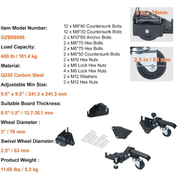 Justerbar mobilbas från 9,5 x 9,5 till oändligheten, med en bärkapacitet på 181,4 kg. Tillverkad av Q235 koldioxidstål, är den robust och utrustad med svängbara hjul för optimal manövrerbarhet. Idealisk för ett universellt stöd, passar den olika paneler med en tjocklek på 0,5 till 1,5 mm.