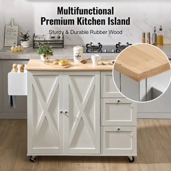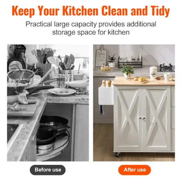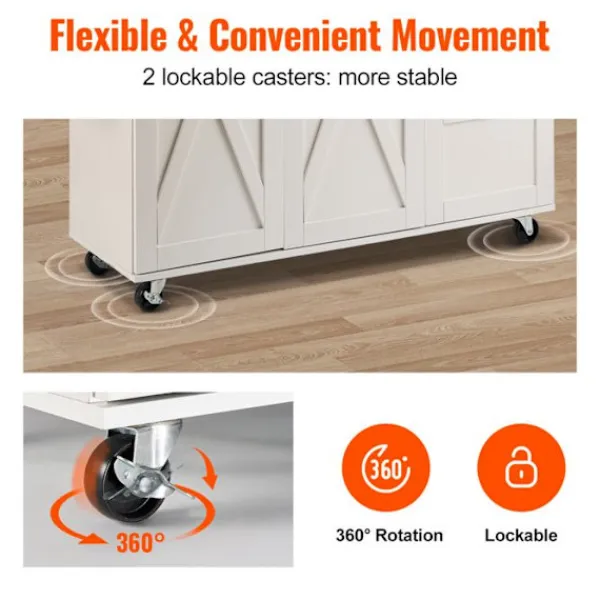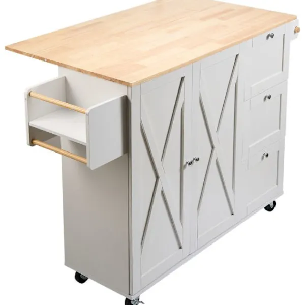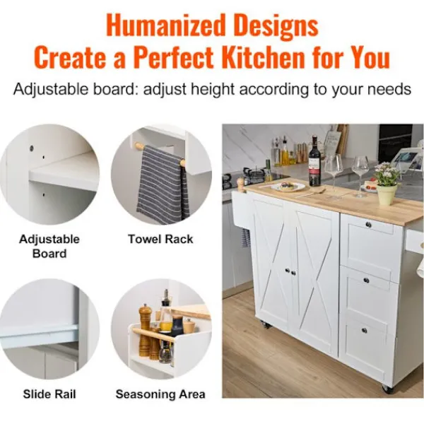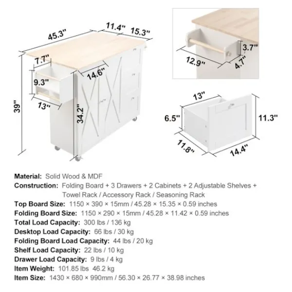 Köksvagn i massivt trä och MDF, vit färg. Mått: 143 x 68 x 99 cm. Total lastkapacitet 136 kg. Utrustad med kryddstöd och handduksställ, är detta praktiska och eleganta möbel idealisk för att organisera ditt kök.