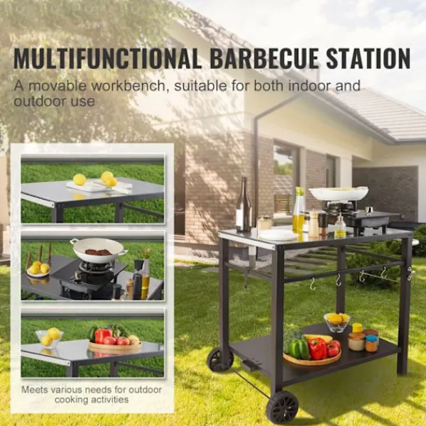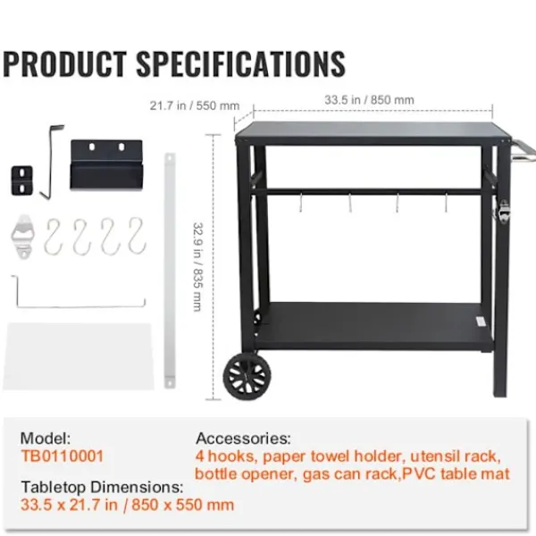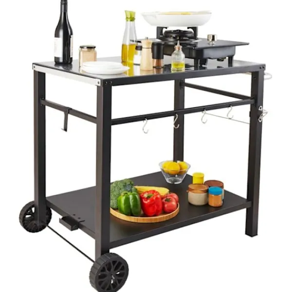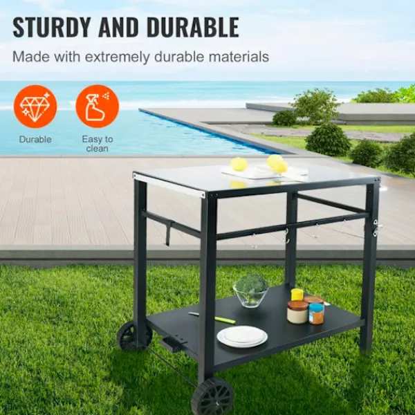 Mobil matvag för utomhusgrill, mått 1000 x 640 x 835 mm, vikt 11,85 kg. Idealisk för livsmedelsberedning, den har 2 hyllor och en bricka på 850 x 550 mm. Praktisk och elegant, den passar perfekt på din terrass.