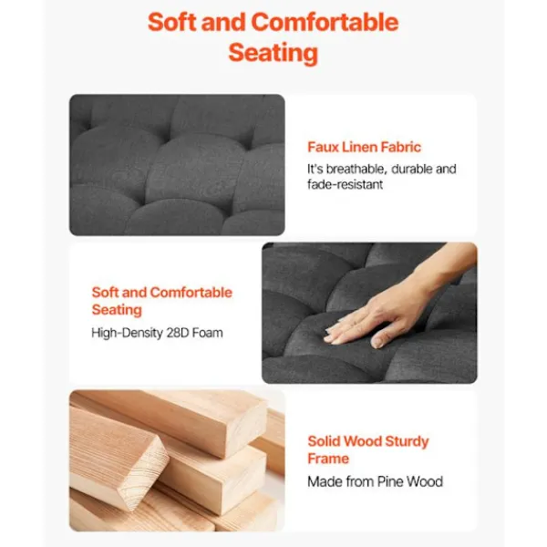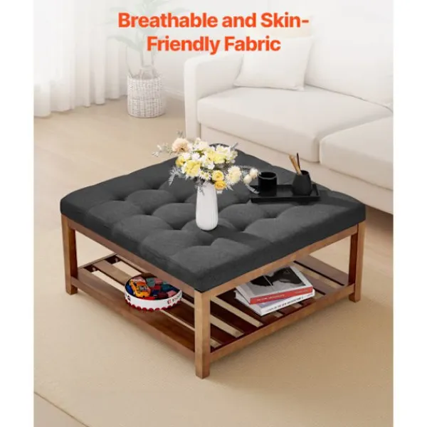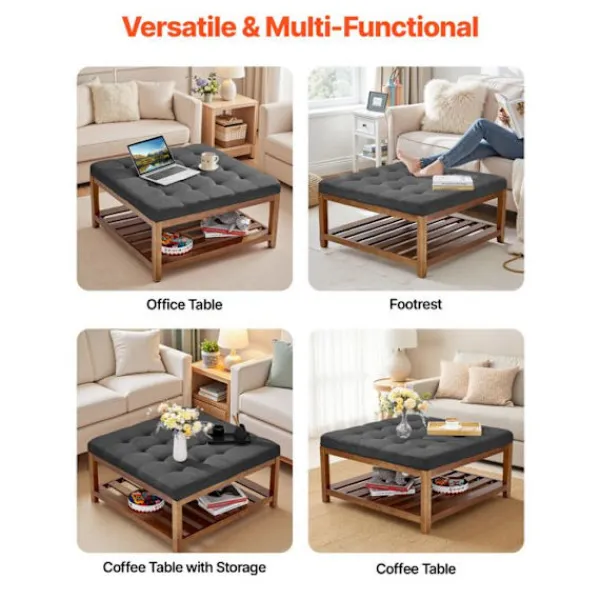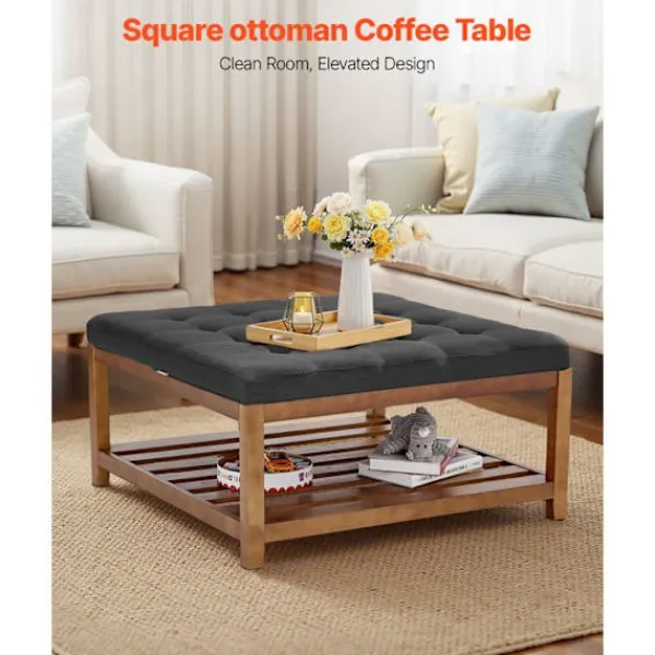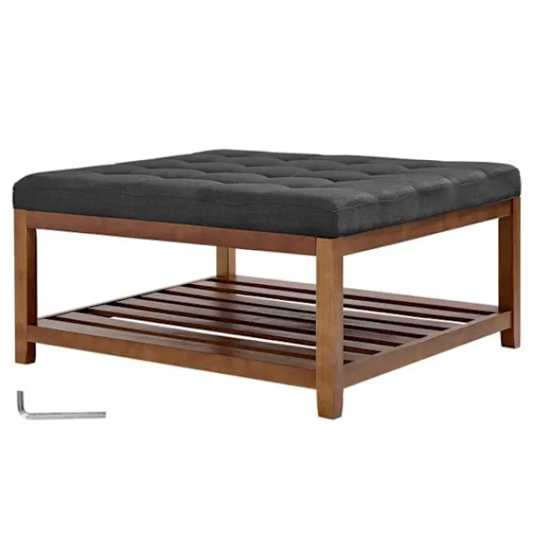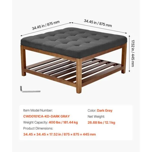 Fyrkantig, tuftad soffbord i mörkgrå linne, idealisk som fotpall eller förvaring. Kapacitet på 181,44 kg, den förenar komfort och hållbarhet. Mått: 875 x 875 x 445 mm. Perfekt för att optimera små utrymmen, den smälter enkelt in i ditt vardagsrum samtidigt som den erbjuder en modern design.