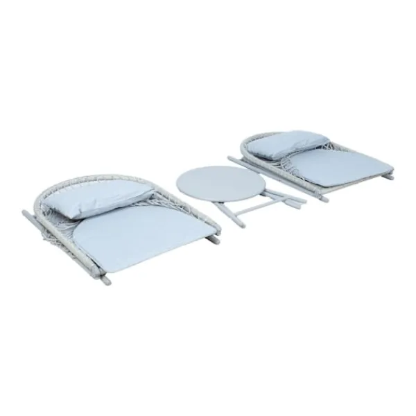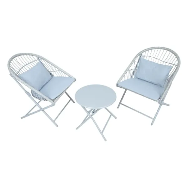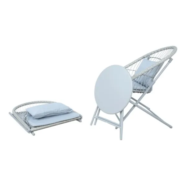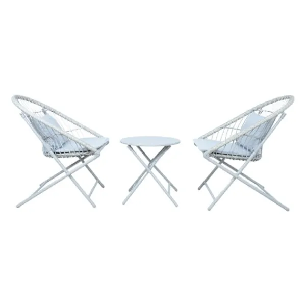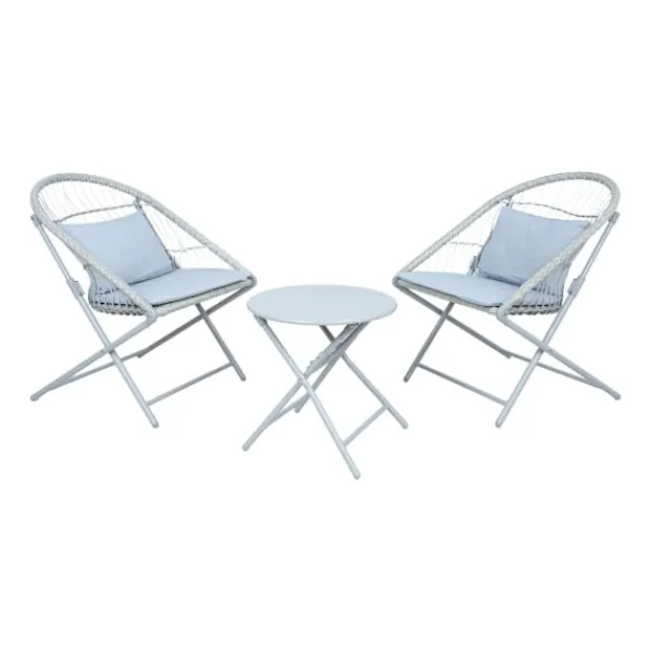 Fällbart balkongset YOLANDA 2 stolar och bord, ljusgrå. Stolarnas och bordets ramar är gjorda av stål och avslutade med grå pulverfärg. Stolens sits är täckt med flätad plast. Ryggstödet är dekorerat med repvävning. I setet ingår ett sätesöverdrag och en ryggdyna klädd i grått polyestertyg. Kudden mäter 44x30cm. Måtten på bordet är D45xH45cm. Måtten på stolen är 60x70xH79cm. Sittbredd 48cm, sittdjup 45cm, sitthöjd 42cm. Måtten på stolen hopfälld är 81x60x8cm, bordets mått hopfällt är 63x45x4cm. FÖRVARING: i slutet av sommarsäsongen rekommenderar vi att förvara trädgårdsmöbler inomhus. Rengör och torka möblerna före förvaring. Använd ett torrt och välventilerat rum för förvaring.