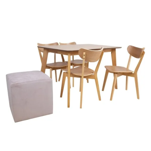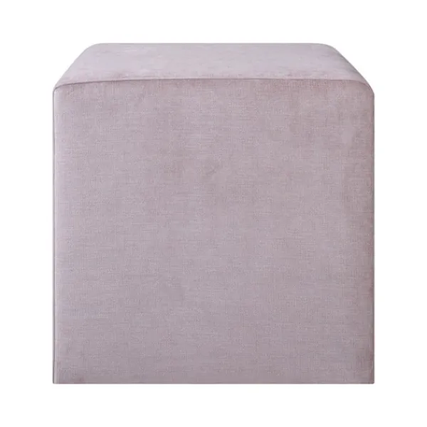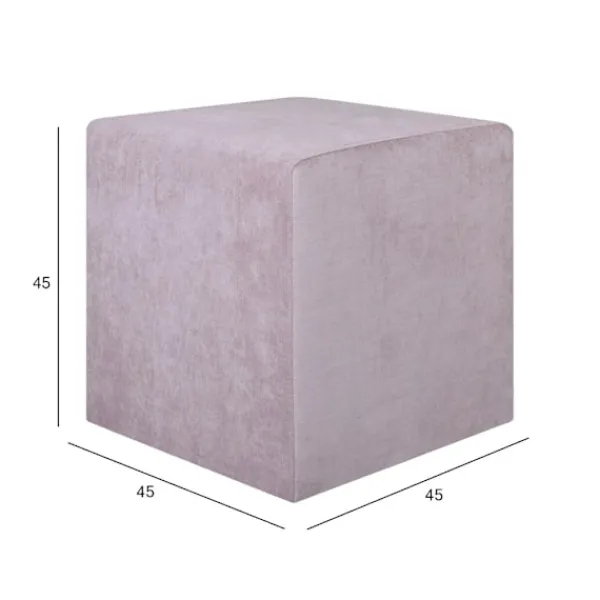 Puff LYN rosa. Puffen är klädd med polyestertyg. Ramen är gjord av massivt trä, hårdpapp och spånskiva. Puffen har fyra plastben. Benen är 1 cm höga. Måtten på produkten är 45x45xH45cm. Produkten är tillverkad i EU.