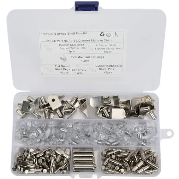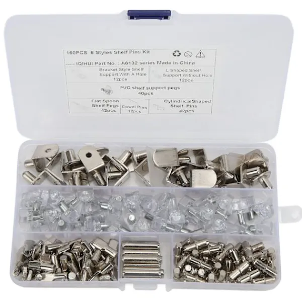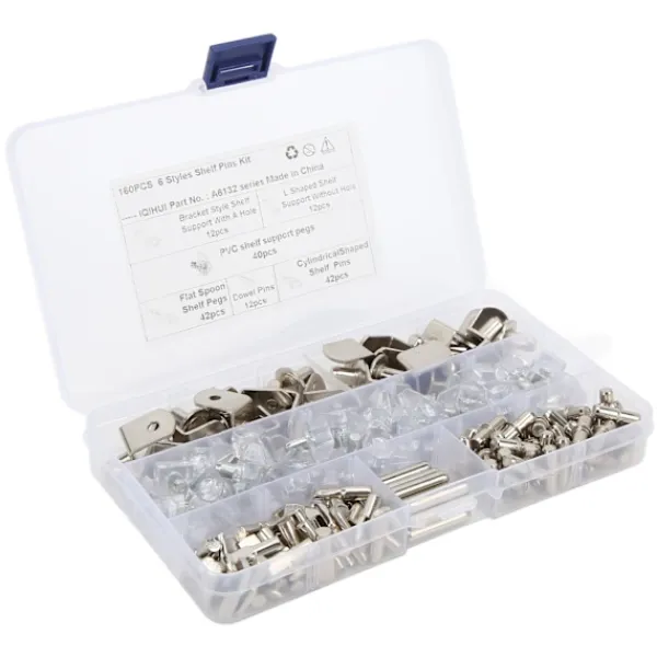 1、Paketet innehåller: Detta set innehåller 160 st 6 stilar hyllor med 12 stift, 12 st L-formade fästen utan hål, 12 L-formade konsoler med hål, 42 platta skedpinnar, 42 cylindriska stifthållare i 1 600 stifthållare i PVC, 400 stift hållare plastlåda. 2、Bred tillämpning: Dessa kan användas för hyllhål på skåp, underhållningscentraler, bokhyllor och mer. De är perfekta i form, storlek och helt i krom. Kan absolut tillgodose alla dina behov. 3, varma tips: För att pluggstiften ska få en tät passform bör ditt hål vara lika med eller något mindre än den diameter som visas. Dessa hyllstöd passar 5 mm hyllhål på skåp. 4, slitstarkt material: Tillverkad av järn+PVC och nickelplätering, bra kvalitet och hållbar för lång livslängd. 5、Installationsposition: Monterad i skåpdörren där mellanväggen behöver stödjas. Kan hålla träskivan i skåpet.