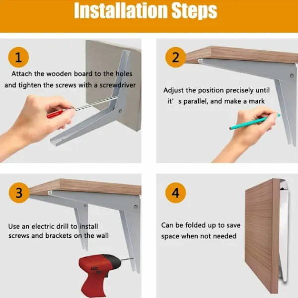 Allmän beskrivning Detta vikbara fäste är tillverkat av högkvalitativt 304 rostfritt stål, vilket ger utmärkt motståndskraft mot korrosion och rost. Tack vare sin speciella design kan det stödja tunga vikter samtidigt som det fälls ihop till en osynlig hylla när den inte används, vilket maximerar utrymmet. Tekniska specifikationer Material: Rostfritt stål med polerad beläggning Färg: Vit Mått: 200 mm x 165 mm x 24 mm (längd x bredd x höjd) Maximal lastvikt: 100 kg Kompatibilitet och tillbehör Fästet kan installeras på olika typer av väggar och är idealiskt för kökshyllor, butiker, verkstäder och mer. Paketet innehåller: 2 vägghyllfästen (1 par) 6 korta skruvar (2 reservskruvar) 4 långa skruvar 4 expansionsankare Installation Installationen är enkel och kräver inga speciella färdigheter. Följ dessa steg: Bestäm positionen på väggen Markera borrläget på brädan Fäst fästet på brädan med korta skruvar Borra ett hål vid markeringen på väggen Sätt in expansionsröret i hålet Fäst fästet med långa skruvar Obs: Se till att avståndet mellan två fästen inte överstiger 60 cm. Använd Detta fäste är mångsidigt och kan användas för: Att skapa ett fällbart bord i ditt sovrum Installera en fällbar sits vid dörren Hänga cyklar eller väskor Ordna hyllor i olika rum i huset