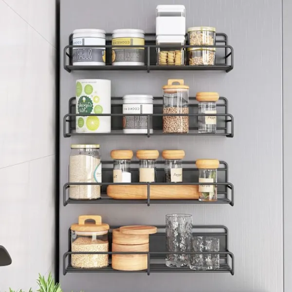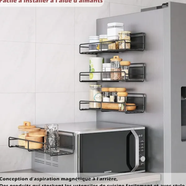 Säkerhet & flexibilitet i köket: Kryddstället har 4,3 cm höga skyddsräcken för att förhindra att kryddor, kryddflaskor och burkar faller ner, vilket garanterar kökssäkerheten. Innovativ användning av stark magnetisk testning, byt det magnetiska kylskåpet om det behövs.