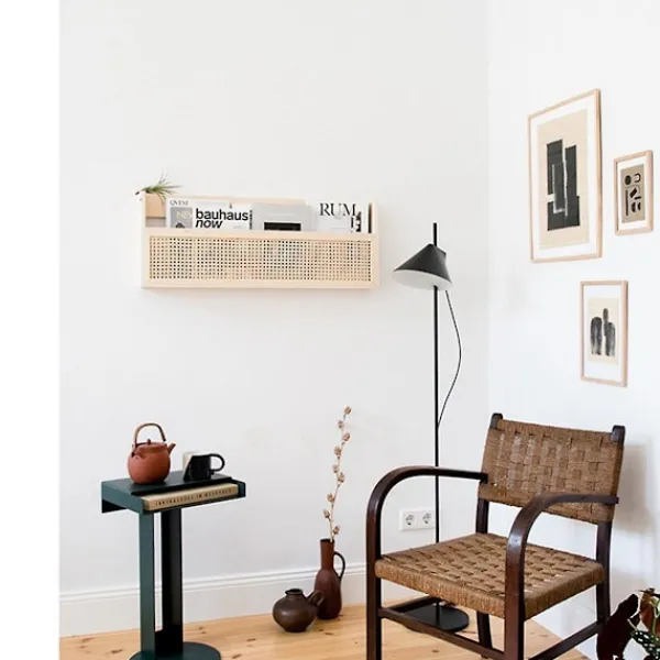 KONSTNÄRLIGA DESIGNFÄRGER: Med naturliga träfärger och noggrant utvalda designelement blandar detta väggmonterade tidningsställ perfekt funktionalitet med estetik; visuellt tilltalande