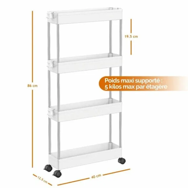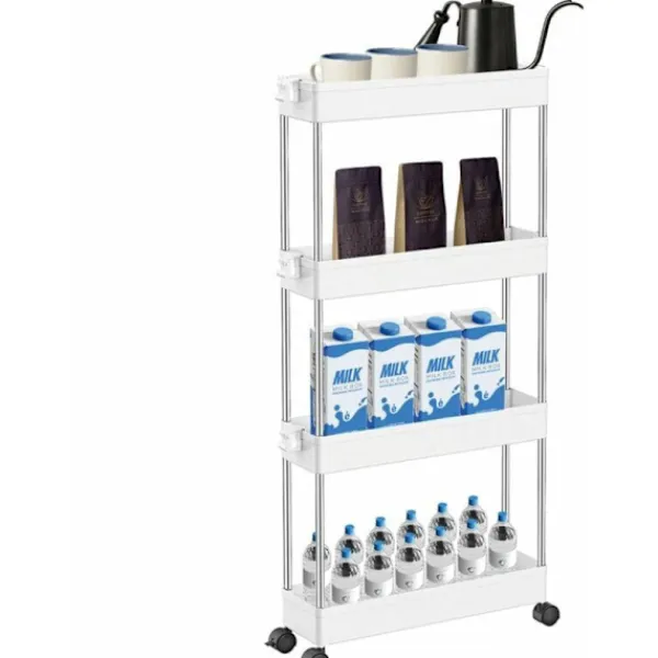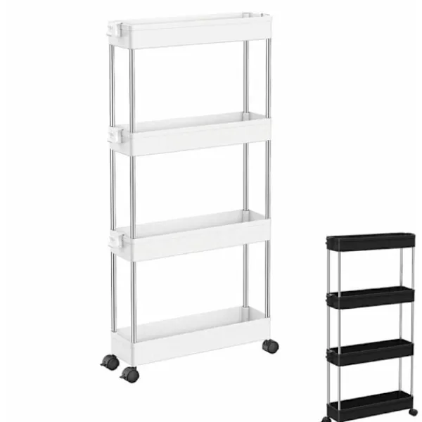 Tillverkad av högkvalitativ plast och med en ram i rostfritt stål, denna smala 4-hyllors förvaringsvagn är stark och hållbar. Varje hylla klarar upp till 5 kilo, tillräckligt för att förvara massor av saker.