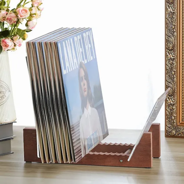 Modern design: Skivhållaren är tillverkad av premium massivt furuträ och klar akryl, reptålig och sprickbeständig för bästa förvaring av skivalbum. Med en snygg brun bas i massivt trä med unik design av klar akrylplatta. Den enkla designen och praktiska funktionen gör att den passar till alla inredningar.