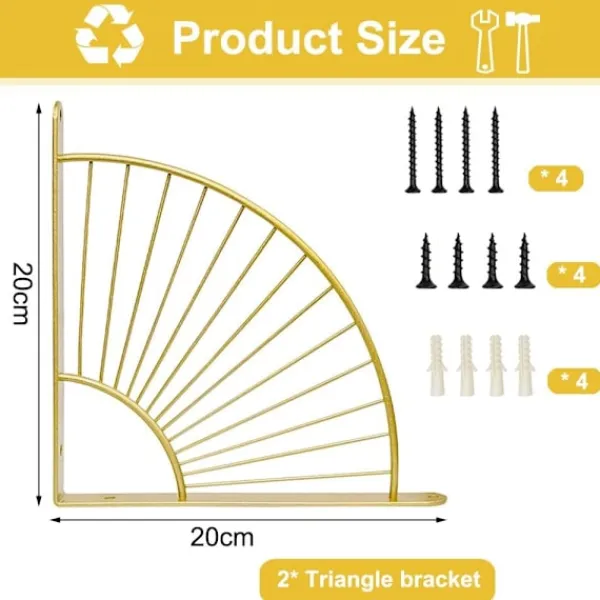 Material: Denna fläktformade konsol är tillverkad av förstärkt rostfritt stål, mycket stark, mässingsfärgad målad yta, slät och hållbar, vattentät och rostbeständig, kanten är slät och skadar inte dina händer, och har stark bärförmåga.