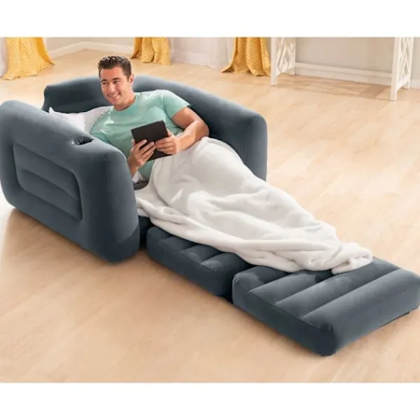 Denna utdragbara fåtölj från Intex med flockad yta är utformad för avkoppling var som helst, oavsett om du är hemma, ser på tv, läser en bok eller bara vill koppla av i den sammetsmjuka fåtöljen och dra ut dynan till två luftmadrasser när det är dags att sova. Den har en 2-i-1-ventil med extra breda öppningar för enkel uppblåsning och tömning. Den kan vikas ihop kompakt för förvaring när den inte används. Mugghållaren gör avkopplingen ännu bekvämare.