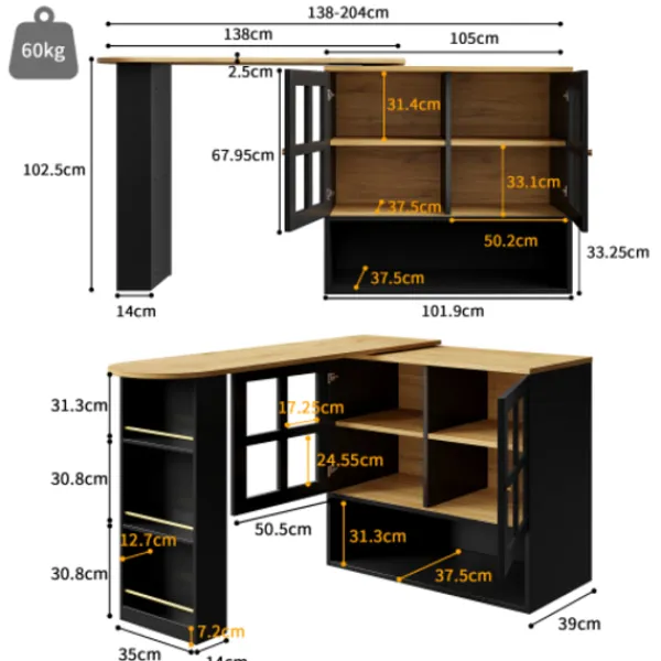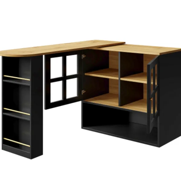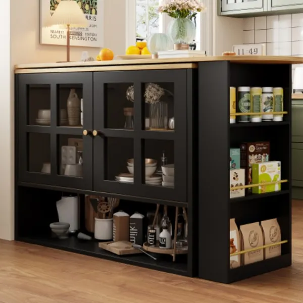 Multifunktionell förvaring: Den har öppen förvaringsplats som kan användas för att visa utsökta dekorationer, ofta använda rätter och mer. Skåpet med dubbla glasdörrar ger sluten förvaring som är dammtät, vilket gör att du kan hålla föremål utom synhåll och skydda din integritet. Den har inbyggda, trelagers, justerbara och flyttbara avdelare.