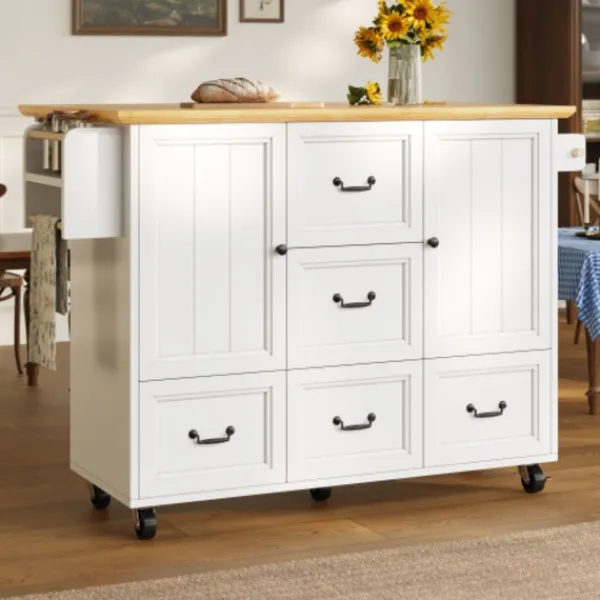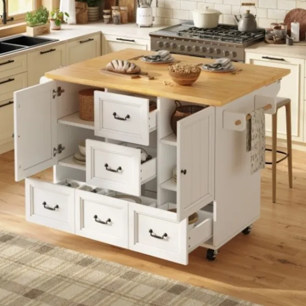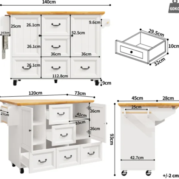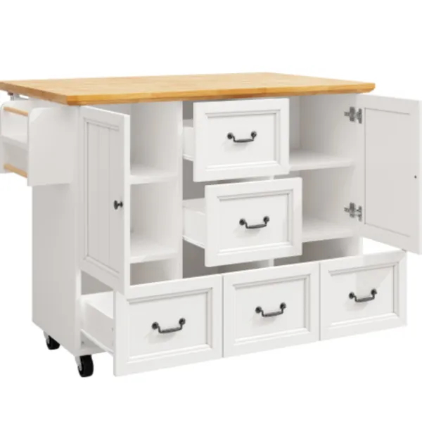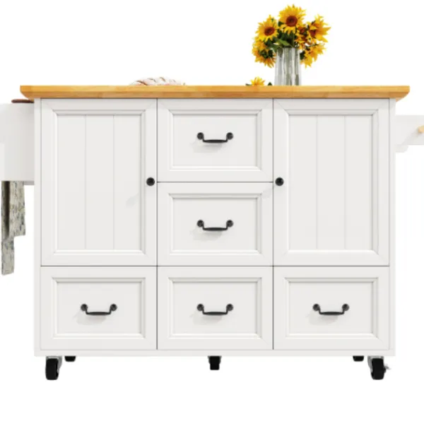 Mobil köksö: Utrustad med fem 360-graders svängbara hjul, varav två är låsbara, vilket möjliggör sömlös förflyttning mellan kök, matsal och vardagsrum.