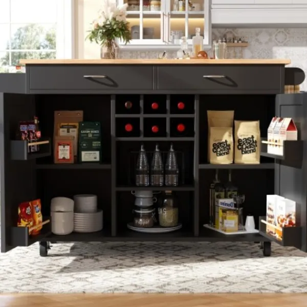 Mobil och fast funktion: Utrustad med 360 graders styrhjul är det bekvämt att flytta skänkens vagn till valfri position du behöver. Om du vill använda den som en fast skänk kan du helt enkelt låsa rullarna för att säkerställa stabilitet.