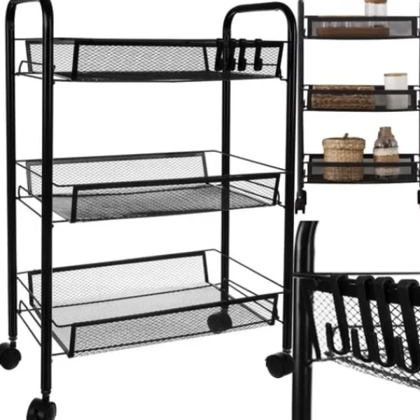 Denna eleganta vagn med tre rymliga hyllor är den perfekta lösningen för att skapa extra förvaringsutrymme i ditt kök, badrum eller kontor. Tillverkad av robust, pulverlackerat järn, är den både hållbar och motståndskraftig mot skador och korrosion. Varje hylla har en korgdesign med en maximal belastning på 7 kg, vilket gör den idealisk för att organisera tyngre föremål som kastruller, verktyg eller kosmetika. Tack vare de medföljande krokarna kan små föremål som handdukar eller köksredskap enkelt hängas upp för att maximera utrymmet.