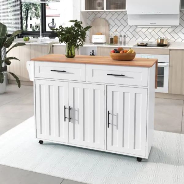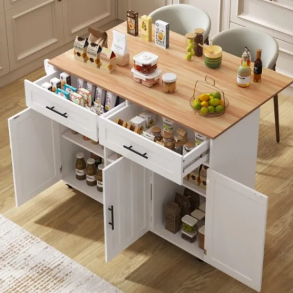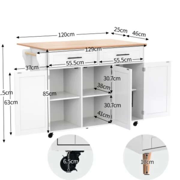 6. Fast förvaringsö: Denna köksö är också utrustad med fyra massiva träben och en mittstödplatta. Om du inte behöver flytta detta skåp kan du byta ut hjulen mot skåpsben.