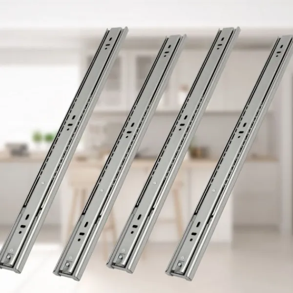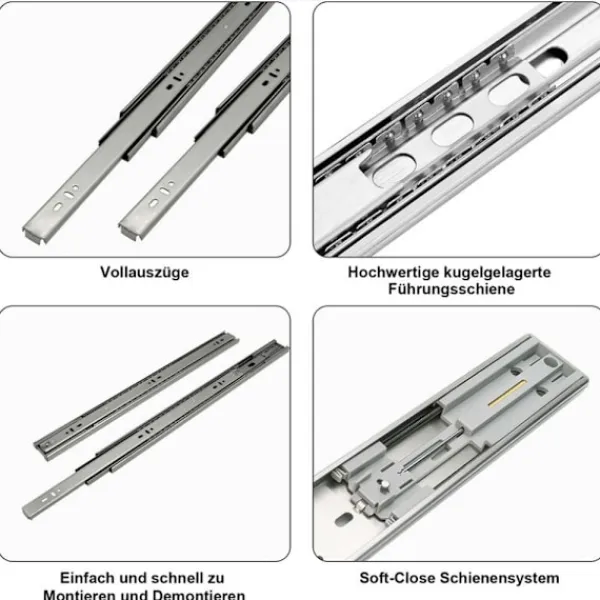 Trefaldiga lådskenor kan förlängas helt, tysta och friktionsfria, tjockt material är robust och hållbart, lådskenor har självstängning och dämpning för att förhindra fastklämning, lämpliga för sovrum, barnrum, vardagsrum, kök, badrum och kontorsmöbler, idealiska för lådinstallationer.