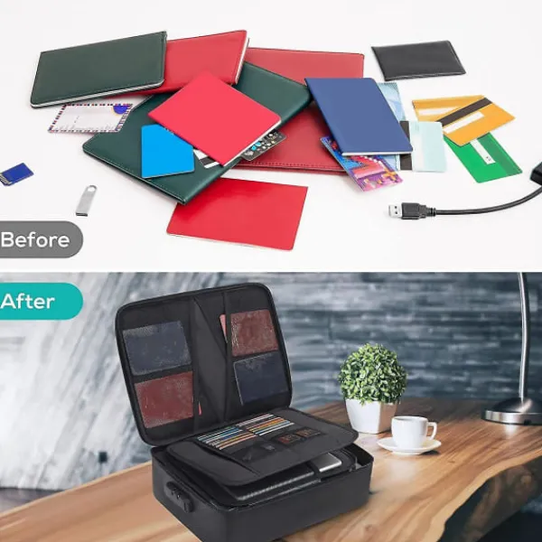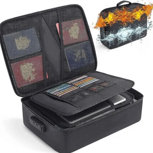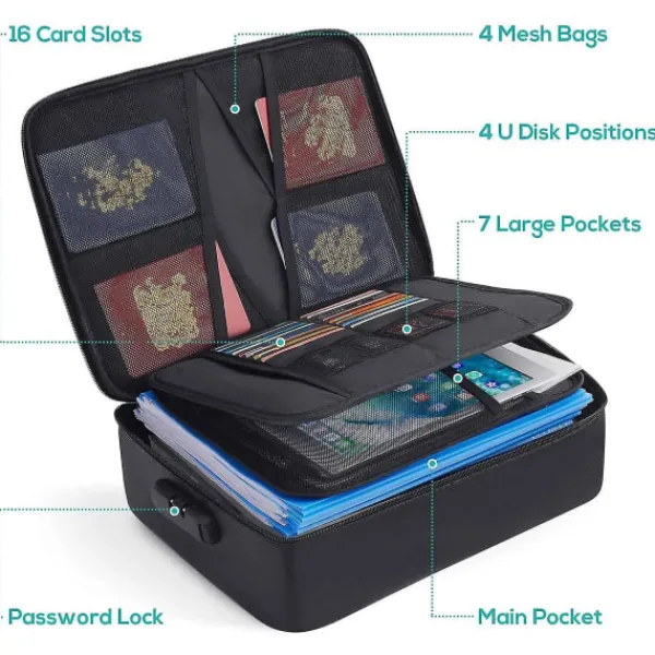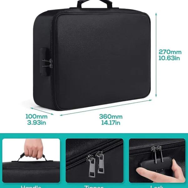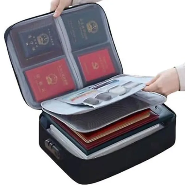 Brandsäker filväska har en trelagersdesign. Detta inkluderar 4 nätfickor, 16 kortplatser, 4 U-diskfickor, 7 mapplager huvudficka med ett utrymme. Den kan förvara dina viktiga dokument, filer, pengar, pass, U-disk, kort, laptop, certifikat på ett säkert och ordnat sätt. Ett utmärkt sätt att organisera dina filer och enkelt hitta de filer du letar efter. [Brandsäker Vattentät Säker]: Brandsäker filförvaringsväska är tillverkad av dubbla lager icke-repande silikonbelagd glasfiber som tål temperaturer upp till 2000. Brandsäker väska är inte bara brandsäker utan också mycket vattenavvisande om den blir blöt av någon anledning. Ingenting är helt idiotsäkert, extra skydd är alltid bra. [Flera Säkerhetsskydd]: Design med ett starkt grepphandtag för att bära allt du behöver, kombinationslås är utformade för att skydda dina värdesaker, och mer remhandtagsdesign på baksidan gör att du kan sätta in ett resväskehandtag. [Lätt att och Bära]: Om du är orolig för att dina värdefulla dokument ska skadas av brand, eller om du är slarvig, kommer det att vara en bra hjälp för att skydda dina värdefulla dokument. Du kan inte bara placera den i ditt hem, kontor, bil, kassaskåp, förvaringsskåp, du kan också ta den med dig till camping, resor och utomhusaktiviteter. [Uppgraderat Säkerhetslås]: 1. Håll låset i öppet läge (det ursprungliga lösenordet är ”0-0-0”); 2. Tryck ner ”Knapp a” med ett verktyg tills ett klick hörs; 3. Ändra lösenordet; 4. Tryck på ”Öppna knapp – knapp c” tills ett klick hörs; 5. Ny inställning för din brandsäkra dokumentlåda Färg: svart Material: silikonfiberväv Storlek: 36 x 10 x 27CM Paketets innehåll: 1 x brandsäker låda Endast ovanstående paketinnehåll, andra produkter ingår inte. Obs: Ljusreflektion och olika skärmar kan göra att färgen på föremålet på bilden skiljer sig lite från den verkliga. Det tillåtna mätfelet är +/- 1-3 cm.