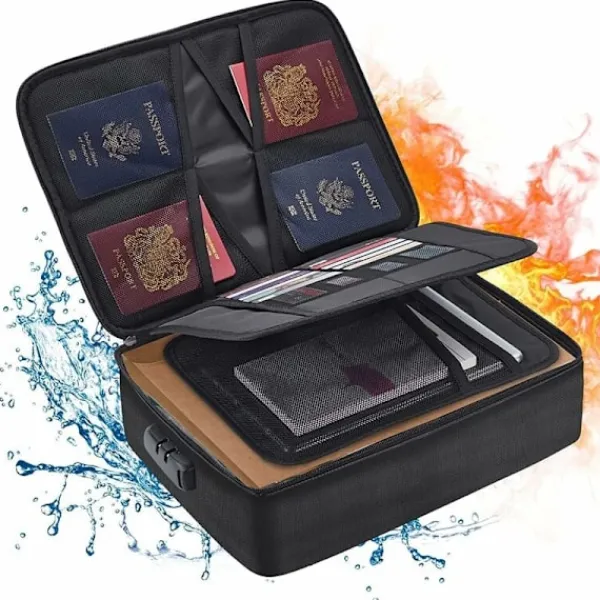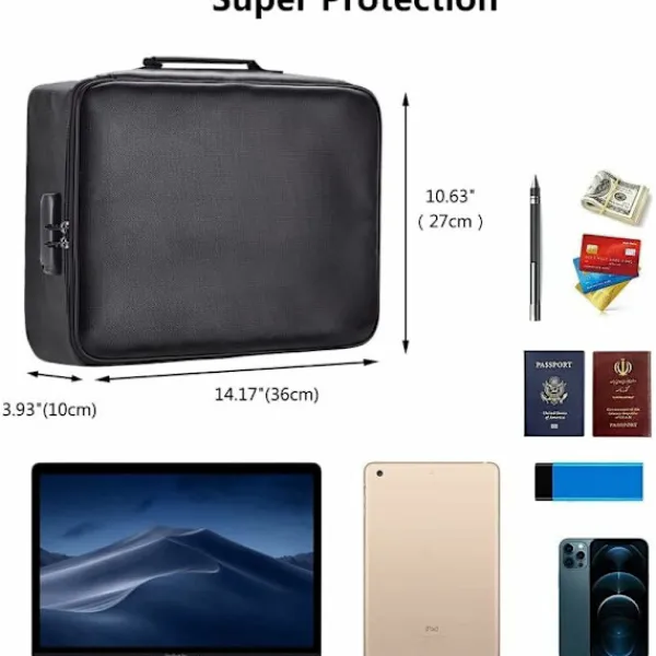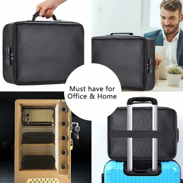 Flerlagers Förvaringsväska: Säker reseväska designad med 3 lager, 4 passficksnät, 16 kortplatser, 4 U-diskfickor, 7 lager av mappar och 1 huvudficka. Du kan snyggt förvara viktiga dokument, filer, pengar, pass, U-disk, kort, laptop, certifikat. Brandsäker & Vattentät: Vår dokumentorganisatör är tillverkad av dubbla lager glasfiber med icke-irriterande silikonbeläggning, hög temperaturbeständighet upp till 1093°C. Det silikonbelagda lagret kommer också att förhindra vatten och hålla dina dokument välorganiserade. Säkerhet med Lås: Den bärbara reseväskan har ett inbyggt kodlås och ett starkt brett handtag, bärbar och lätt att ta med var som helst för resor eller hemmabruk. Du kan ställa in ett lösenord efter mottagandet, enkelt och bekvämt att använda. Bred Användning: Den stora resväskorganisatören kan placeras inte bara i hemmet, kontoret, bilen, kassaskåpet, förvaringsskåpet, utan kan också användas för camping, resor, affärsresor och andra utomhusaktiviteter. Produktmått 36L x 10B x 27H centimeter. Kodlåsdesign. Originalnumret är 0-0-0. För att ställa in din personliga kombination, följ dessa steg: 1. Placera rattarna på originalnumret 0-0-0. 2. Tryck på återställningsknappen (a) med ett verktyg tills du hör ett ”klick ”. 3. Ställ in din kombination genom att vrida på rattarna (C), till exempel 8-8-8.