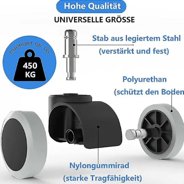 Hög kvalitet: hjulen för kontorsstolar är hållbara, lätta och har hög lastkapacitet (upp till 450 kg). Hårda golv är belagda med högkvalitativ polyuretan – detta ger skydd mot golvskador och märken och sparar pengar på dyra golvreparationer. Tyst och glidande: dubbla hjul är perfekta för att minska belastningen. Detta ger dig stabilitet och gör styrningen enklare än med ett enkelhjul. De högkvalitativa gummihjulen på kontorsstolen är tysta och glider smidigt. Även om du arbetar på natten eller spelar spel behöver du inte oroa dig för att störa andra, så du kan fokusera på ditt arbete. Allmän tillämpning: kontorsstol kan användas för kakel, parkett, laminat, betong- eller vinylgolv. Dessa 11 mm x 22 mm högkvalitativa hjul kan monteras på ett brett utbud av stolar, t.ex. lyxiga läderstolar, datorstolar, hemmakontor och andra kontorsstolar. Detta är ett bra val. De är dock inte lämpliga för användning på stolar. Mät innan du köper. Enkel installation: inga verktyg krävs för installation, det kan göras manuellt. Ta bara ut den gamla kontorsstolen och skjut in de nya hjulen så är den redan monterad. Det tar inte ens så lång tid som att dricka en kopp kaffe innan din stol återupplivas. Hela processen tar bara 5 minuter. Färg: Grå+svart Material: plast Paketets innehåll: 5 x stolhjul Endast ovanstående paketinnehåll, andra produkter ingår inte. Obs: Ljusreflektion och olika skärmar kan göra att färgen på föremålet på bilden skiljer sig lite från den verkliga varan. Det tillåtna mätfelet är +/- 1-3 cm.
