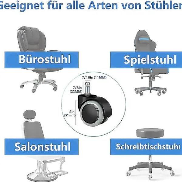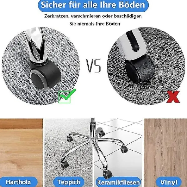 Hög kvalitet: Kontorsstolens hjul är slitstarka, lätta och har en hög lastkapacitet (upp till 450 kg). Hårda golv är belagda med högkvalitativ polyuretan – detta ger skydd mot golvskador och märken och sparar pengar på dyra golvreparationer. Tyst och halkfritt: Dubbla hjul är perfekta för att minska belastningen. Detta gör att du får stabilitet och gör styrningen enklare än med ett enkelhjul. De högkvalitativa gummihjulen på kontorsstolen är tysta och glider smidigt. Även om du arbetar på natten eller spelar spel behöver du inte oroa dig för att störa andra, så du kan fokusera på ditt arbete. Allmän tillämpning: Kontorsstolen kan användas för kakel, parkett, laminat, betong eller vinylgolv. Dessa 11 mm x 22 mm högkvalitativa hjul kan monteras på ett brett utbud av stolar, såsom lyxiga läderstolar, datorstolar, hemmakontor och andra kontorsstolar. Detta är en . De är dock inte lämpliga för användning på stolar. Mät innan du köper. Enkel installation: Inga verktyg krävs för installation, det kan göras manuellt. Ta bara ut de gamla kontorsstolshjulen och skjut in de nya hjulen, de är redan monterade. Det tar inte ens en kopp kaffe för din stol att återupplivas. Eftersom hela processen bara tar 5 minuter. Färg: Grå+SvartMaterial: PlastPaketets innehåll: 5 x StolhjulEndast ovanstående paketinnehåll, andra produkter ingår inte.Obs: Ljusreflektion och olika skärmar kan göra att färgen på föremålet på bilden skiljer sig något från den verkliga varan. Det tillåtna mätfelet är +/- 1-3 cm.