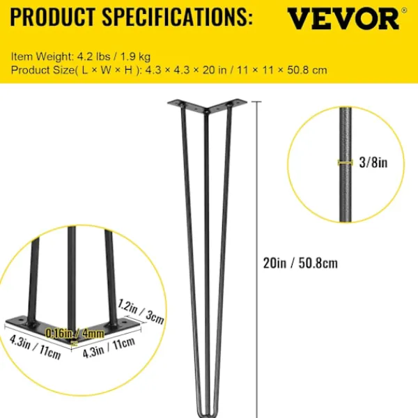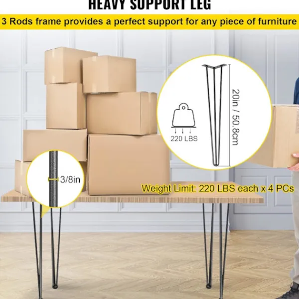 Slitstarkt stål med pulverlackering: Våra hårnålsbordsben har tre 3/8” stålstänger, vilket gör dem mer stabila och starkare än 2 stänger. Varje ben kan stödja max. 100 kg belastning utan deformation (4 set ben upp till 400 kg belastning). Benen är ytbehandlade med pulverlackeringsteknik och är blanka, rostfria och släta vid beröring. Stabilitet och ett rent utseende för att klara allt.