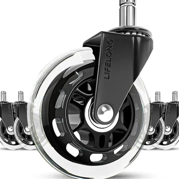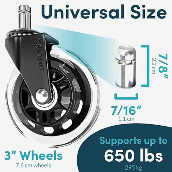 ERSÄTTNING FÖR DE FLESTA KONTORSSTOLAR Du kan vara säker på att våra kontorsstolshjul är kompatibla med nästan alla rullande stolar (vänligen kontrollera storleken på dina hjulstubbar innan du beställer). VIKTIGT: INTE kompatibla med IKEA-stolar.” (vår spindelstorlek är 7/16″ x 7/8″)