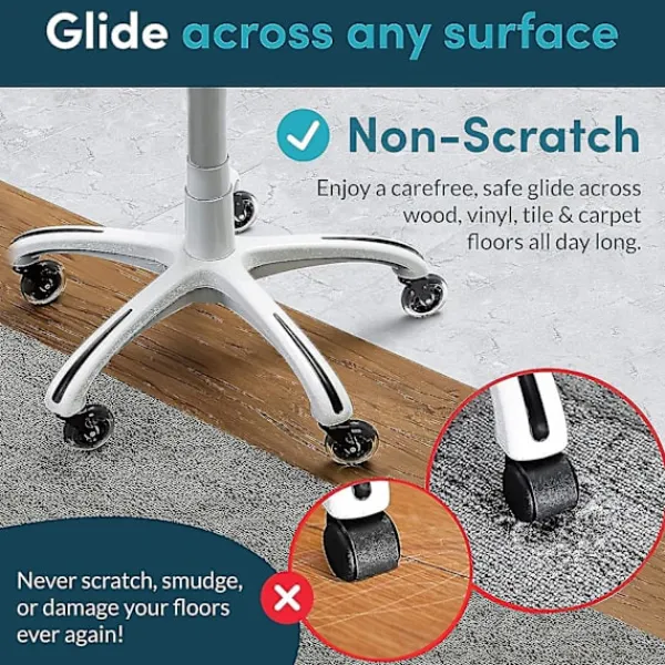 SKRIVBORDSSTOLSMATTA BEHÖVS INTE LÄNGRE Våra ersättningshjul för skrivbordsstolar kommer ALDRIG att repa, kladda eller skada dina golv. Njut av en bekymmersfri, säker glidning över trä-, hårdträ-, laminat-, vinyl-, kakel- och mattgolv hela dagen lång. P.S. Angående den jämna rullningen på mattan beror det på vilken typ av matta du har, vissa rullar bättre och vissa är inte lika smidiga. Hög luggmatta rullar vanligtvis mindre smidigt än låg lugg.