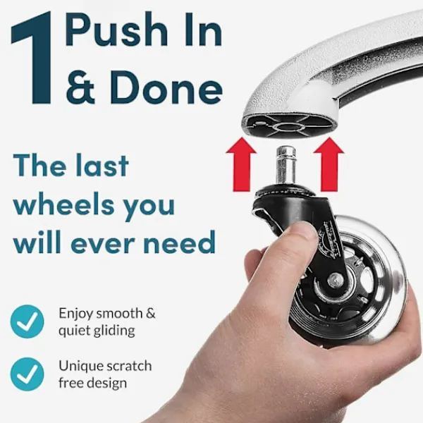 SMIDIG GLIDNING ÄR TYST SOM EN MUS Ett gnisslande, rangligt kontorsstolshjul är ett säkert tecken på att de är billiga och dåligt gjorda. Du kommer att glida runt i total tystnad med våra svängbara hjul