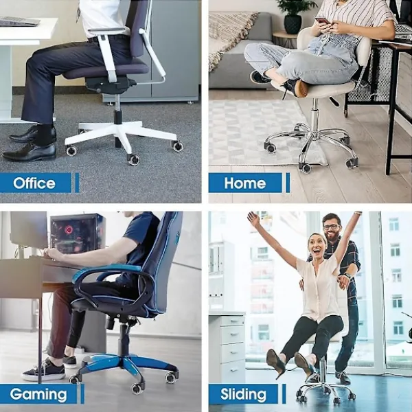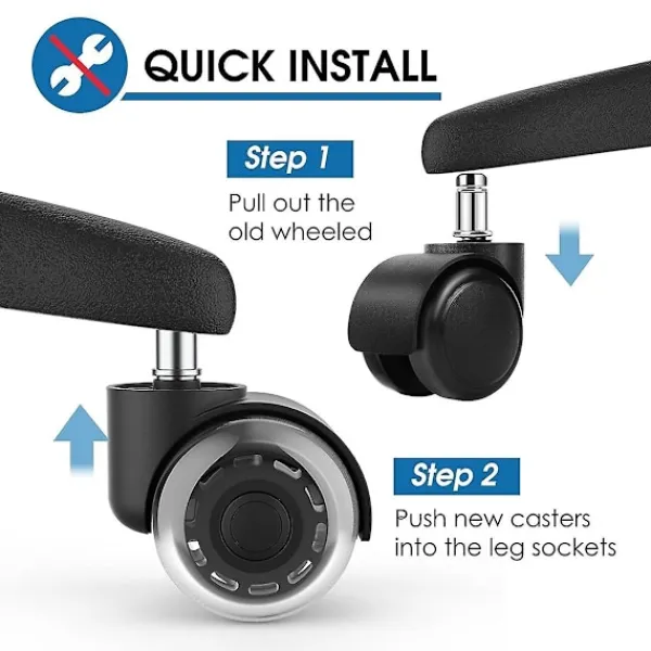 Snabb installation: Säg adjö till komplicerad installation! Våra 2-tums kontorsstols hjul är superenkla att installera – inga verktyg behövs. Ta enkelt bort de gamla hjulen från stolen och sätt in de nya hjulen ordentligt för en säker passform. OBS: Våra stolshjul är inte kompatibla med stolar. Vår stam mäter 7/16 tum x 7/8 tum. Kontrollera storleken på din hjulhållare innan du beställer