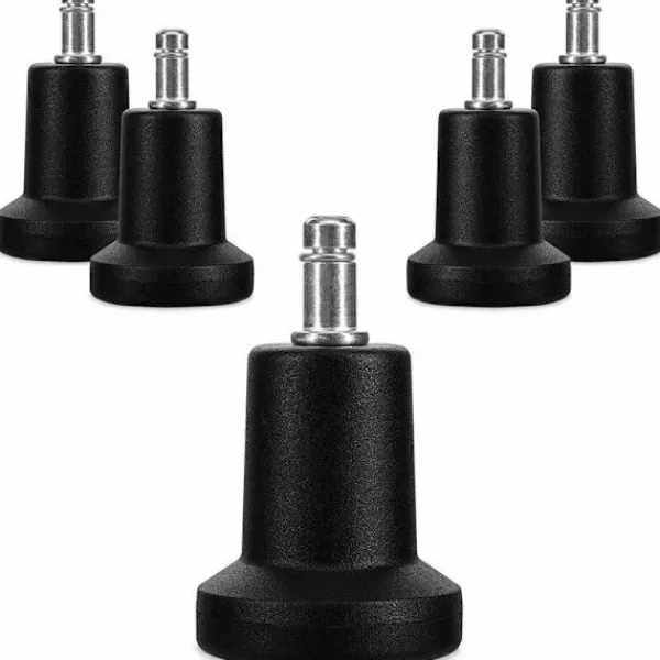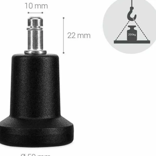 STABIL: Byt ut dina stols hjul mot klockor för mer stabilitet! De fasta ändstyckena gör att du kan konvertera den vridbara kontorsstolen med hjul till en fast stol utan att förlora stolens höjd. SET OM 5: Med detta set om 5 klockor har du ett praktiskt ersättningsset för t.ex. kontors- eller gamingstolar. Den är lämplig för klassiska kontorsstolsmärken. DIMENSIONER: Ytterdiameter: 50 mm och innerdiameter: 10 mm (ej kompatibel med 11 mm) | Maximal vikt som stöds för 5 hjul: 200 kg | Spindellängd: 22 mm. SKYDD: De fasta ändstyckena fungerar som gummiskydd för alla dina golv. De är designade för att användas på en hård yta: parkett, lino, laminat, kakel, etc. ENKEL INSTALLATION: Inga verktyg krävs för montering. Ta bort dina hjul från sätet och fäst klockorna på plats. Enkelt! Tryck helt enkelt in klockorna i den avsedda platsen på din stol. Inga skruvar eller andra verktyg krävs. Snabbt och enkelt byte! Plastskydden förvandlar dina stolar med hjul till fasta stolar och är idealiska för hårda golv som parkett, linoleum, kakel och andra… De 5 klockorna tål en vikt på cirka 200 kg vid användning vid ett skrivbord. Tekniska data: Material: nylon, plast, järn Maximal vikt som stöds för 5 hjul: 200 kg Leverans: 5x kontorsstolsklocka