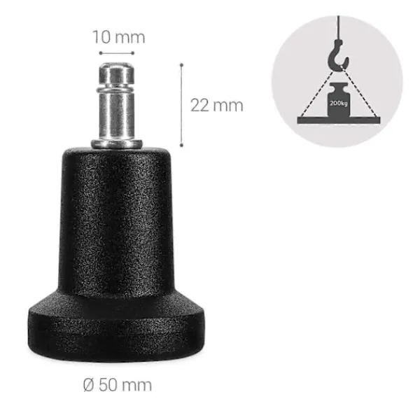 STABILA: Ersätt dina stolsfötter med dessa fötter för ökad stabilitet! De fasta ändstyckena gör att kontorsstolen med hjul kan omvandlas till en fast stol utan att förlora stolens höjd. SET OM 5: Med detta set om 5 fötter har du ett praktiskt reservset för till exempel en kontors- eller gamingstol. Den är lämplig för klassiska kontorsstolsmärken. DIMENSIONER: Ytterdiameter: 50 mm och inre: 10 mm, Maximal vikt som stöds för 5 hjul: 200 kg, spindellängd: 22 mm
