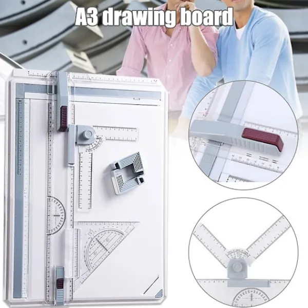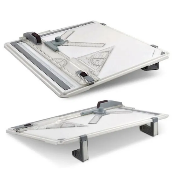 Funktioner: 1. Ritbord tillverkat av okrossbar plast för lång hållbarhet. 2. Tack vare de halkfria fötterna är precisionsarbete möjligt på släta ytor som stål eller glas. 3. A3-mapp för dina ritningar, 2 fötter för 2 olika lutningsvinklar, gradskiva, parallell ritlinjal med 2-punktsguide för smidig glidning och en triangel! 4. Två magnetiska monteringsklämmor och en hörnkklämma säkerställer att ritningen hålls säkert och förhindrar att den glider. 5. Den har en enkel och bekväm arbetsställning. Det är ett användbart verktyg för designers. Paketlista: 1 x A3 Ritbord