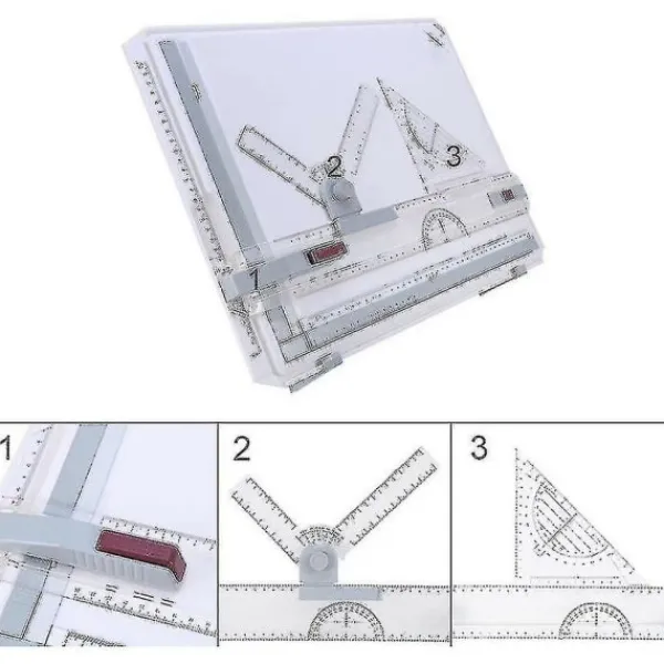 Funktioner: 1. Ritbräda tillverkad av obrytbar plast för lång hållbarhet. 2. Tack vare de halkfria fötterna är exakt arbete på släta ytor som stål eller glas möjligt. 3. A3-mapp för dina ritningar, 2 fötter för 2 olika lutningsvinklar, vinkelmått, parallell ritningskena med 2-punktsguide för smidig glidning och en triangel 4. Två magnetiska fästklämmor och en hörnklämma gör att ritningen hålls säkert och förhindrar att ritningen glider. 5. Den har sin lätta och bekväma arbetsposition. Det är ett användbart verktyg för designers. Inkluderar: 1 x A3 ritbräda