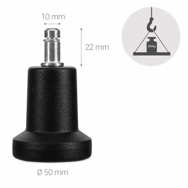 DIMENSIONER: Ytterdiameter: 50 mm och innerdiameter: 10 mm, Maximal vikt som stöds för 5 hjul: 200 kg, spindellängd: 22 mm