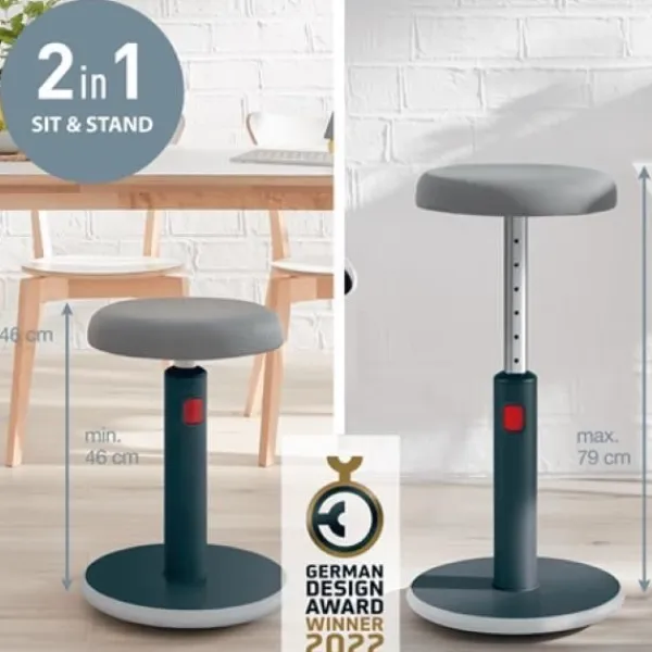 Leitz Ergo Cozy 2-i-1 ergonomisk pall, justerbar från 46 till 79 cm, för att enkelt flytta från sittande till stående. Rundad bas för att svänga och svänga, stärka ryggen och uppmuntra rörelse. Slitstark skumsits med 3D-nätöverdrag, ger komfort och stöd. Lätt, stabil på alla höjder, med halkfri bas, IGR-, TÜV- och GS-certifierad. Elegant och hållbar design, garanterad i 5 år.