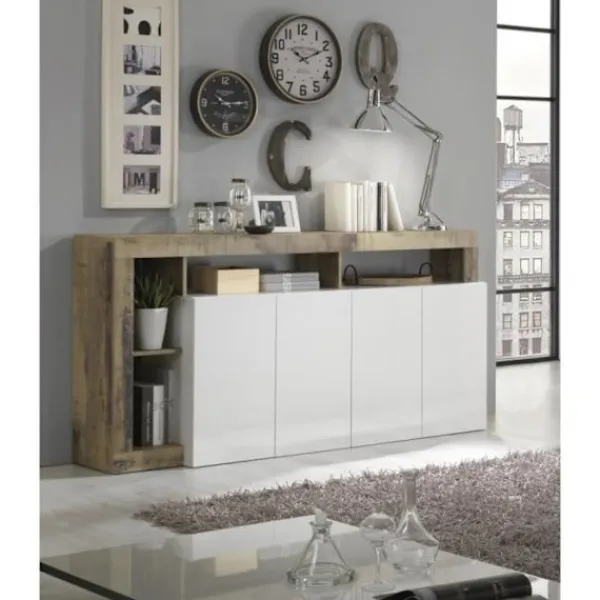 Maestro 4-dörrars skänk Vitlackerad Finish & Vintage Träeffekt L184xH93xD42. Modern stil / Design – Maestro-kollektionen spelar designkortet med sina rena och tidlösa linjer, välj denna skänk som kommer att bli en sensation i din matsal eller vardagsrum!