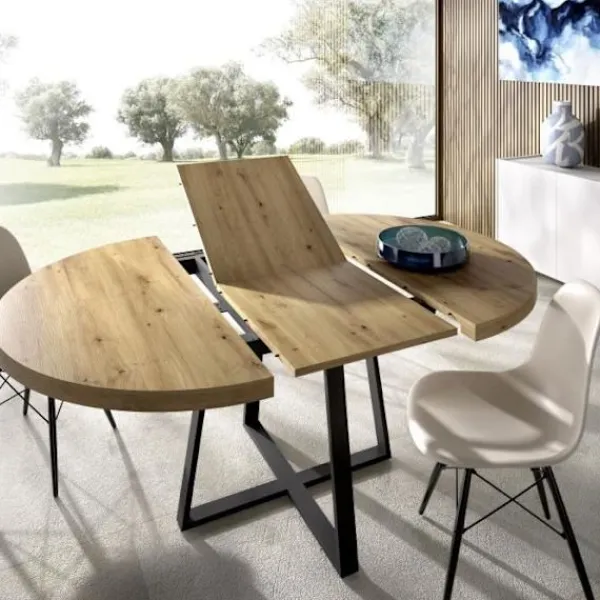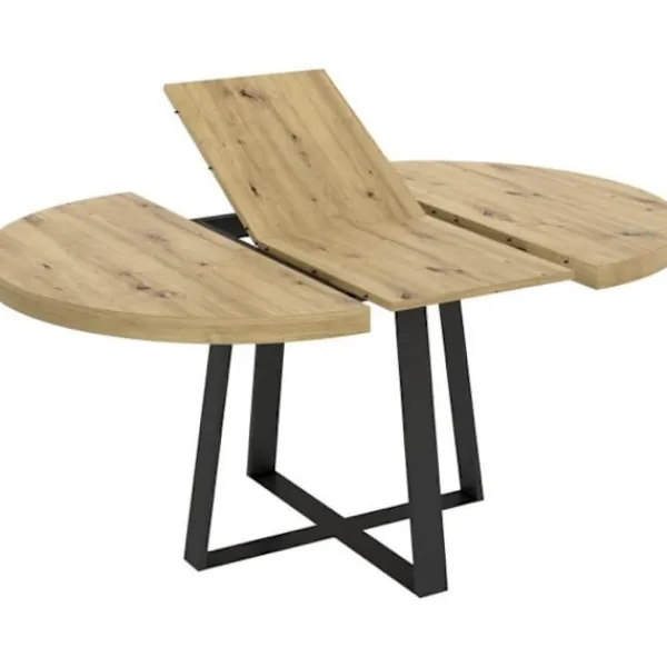 Satsa på det utdragbara runda bordet DUNA i naturlig ek och svart med metallben. Upp till 6 personer. Totalmått L110 x D110/152 x H77 cm. Enkel montering. Modern stil och design. europeisk tillverkning.