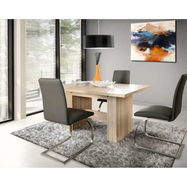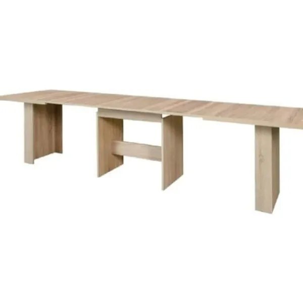 Utdragbart matbord för 6 till 12 personer med modern stil och elegant design. Sonoma spånskiva med ekdekor ger en finish i trälook. Totalmåtten är L 140-273 x B 90 x H 75 cm. Denna vardagsrumsmöbel är för självmontering och tillverkad i Europa.